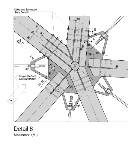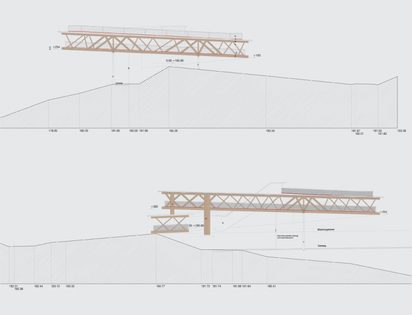 The belvedere is in the shape of a hollow triangle positioned on the plateau overlooking Koblenz. A walkway, accessible to visitors with limited mobility, leads from a gallery – a potential exhibition space – to the roof, along a pathway offering, by turns, views of the park, the city and the belvedere itself. The cantilever symbolises the project: it extends more than 15 metres out over the valley, and rises 10 metres above the ground. The choice of materials (native wood species for the structure and walkway, and Cor-Ten steel for the structural elements), meant that the entire construction could be pre-fabricated. The marriage of architectural research, and engineering to ensure stability, have resulted in a lightweight structure with dynamic visitor circulation. The lateral trusses create a mosaic of the surrounding countryside and allow the structure to be relatively free-standing.